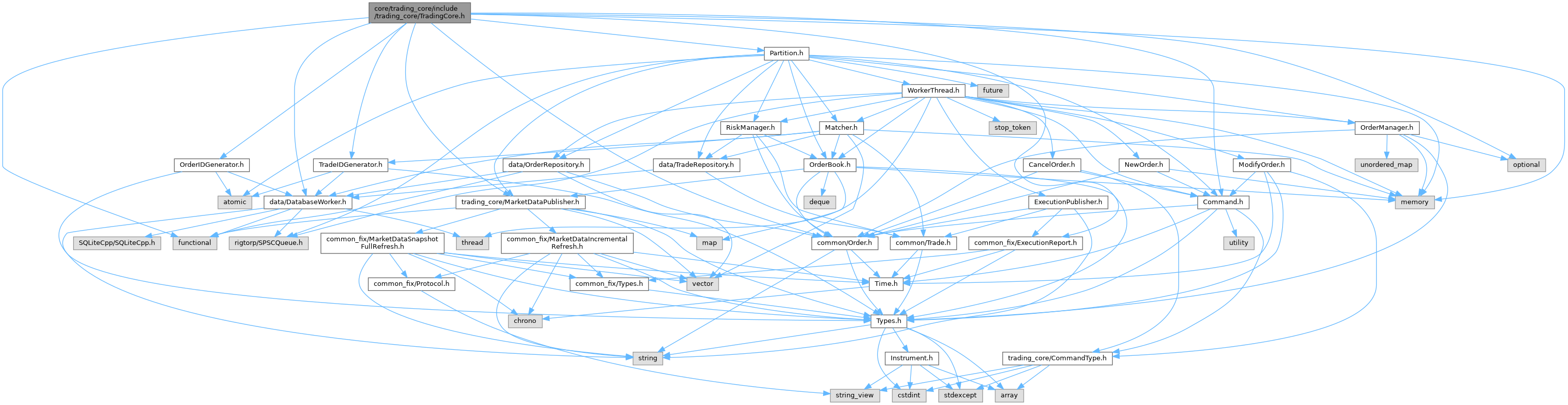 Declares the TradingCore which manages partitions, the database worker, and the lifecycle of the trading engine.